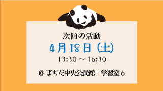お知らせ 4月18日の活動:まちだ中央公民館 学習室6で開催します 2026年4月18日(土)の活動は、まちだ中央公民館 7階「学習室6」で開催します。通常の開催場所と異なりますので、参加される方はご留意ください。町田市原町田6-8-1 町田センタービル 7F(町田市生涯学習センターと同じ場所です) ... 2026.04.18 お知らせ