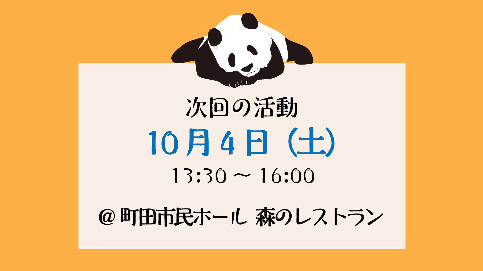 10月4日の活動:市民ホール森のレストランで開催します お知らせ 2025.10.03 2025年10月4日(土)の活動は、町田市民ホール1F 森のレストランで開催します。通常の開催場所と異なりますので、参加される方はご留意ください。町田市森野2丁目2-36 1階 参加にあたっては、「森のレストラン」のメニューから1オーダーをお願いいたします。